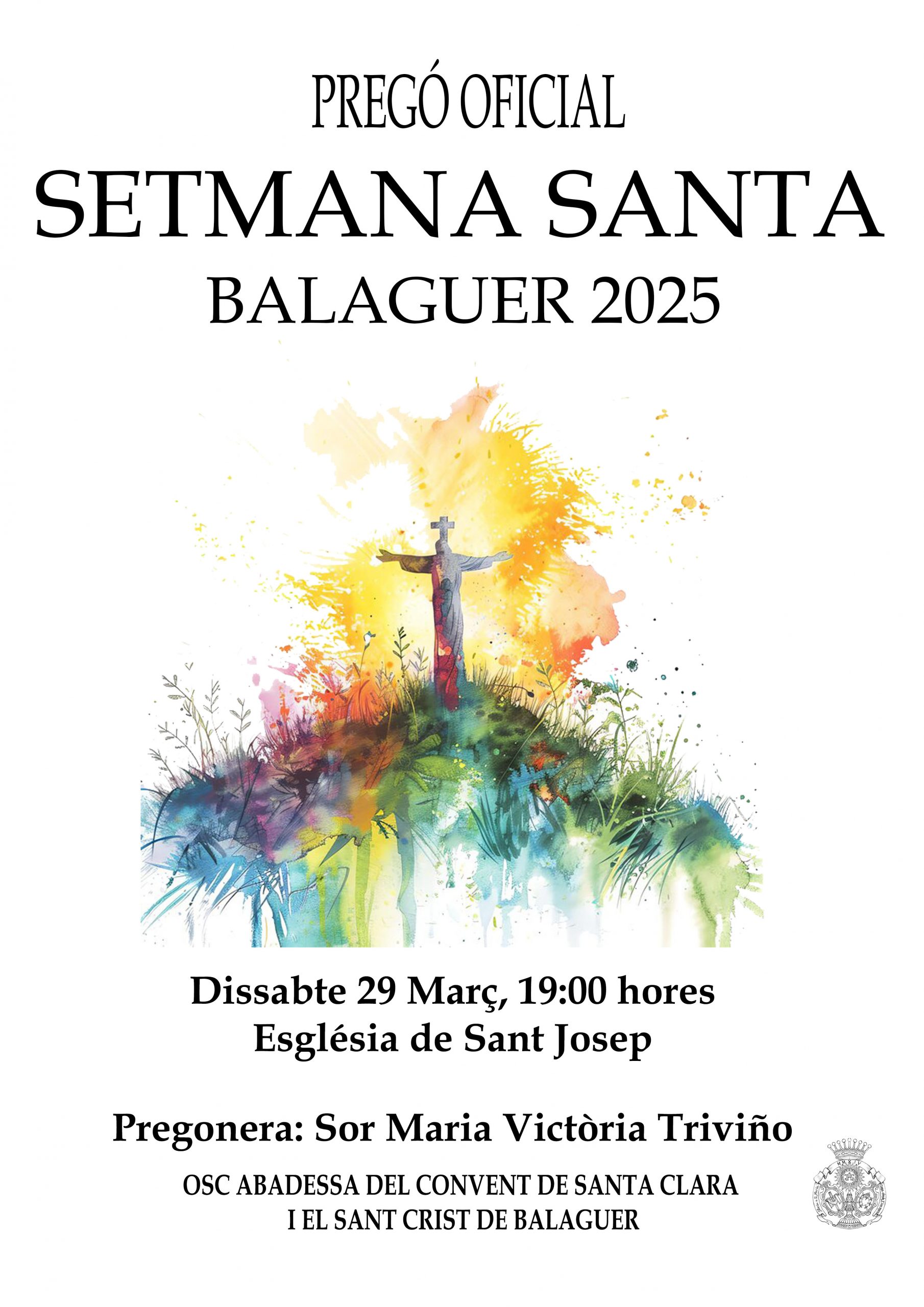 El proper dissabte 24 de febrer a les 19h tindrà lloc a l’església de Sant Josep de Balaguer el pregó de Setmana Santa 2024. Enguany